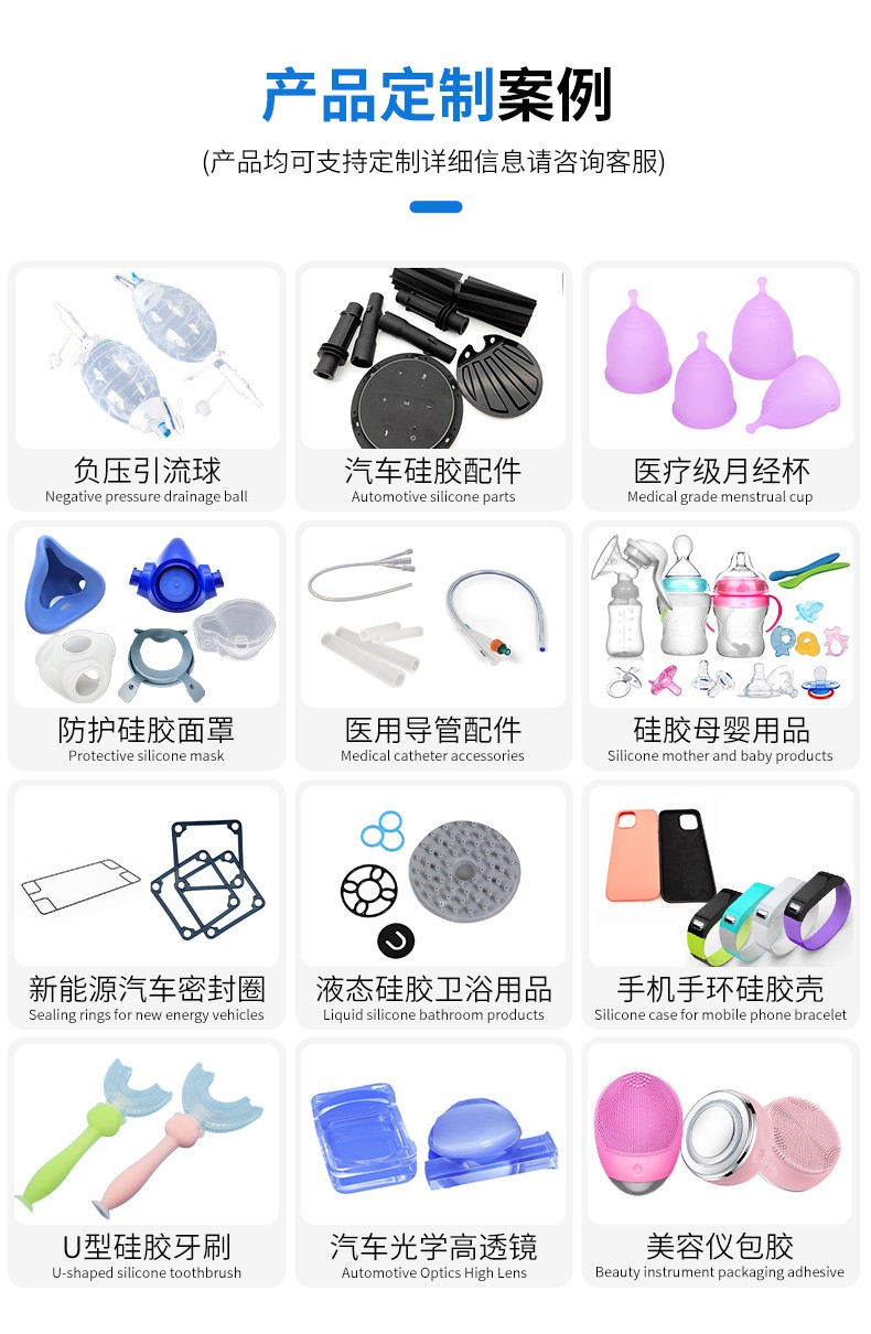 食品級液態(tài)硅膠注射成型高質(zhì)量制品,無色無毒無味,安全環(huán)保。液體硅膠具有優(yōu)異的透明度、抗撕裂強(qiáng)度、回彈性、抗黃變性、熱穩(wěn)定性、耐水、透氣性好、耐熱老化性和耐候性,同時(shí)粘度適中、便于操作,制品透明性高,可看到模具內(nèi)灌鑄材料是否有氣泡等缺陷,線收縮率≤0.1%,復(fù)制制品尺寸精密。我們的制品廣泛應(yīng)用于嬰幼兒用品、醫(yī)療用品及電子產(chǎn)品(密封件,按鍵)等等。